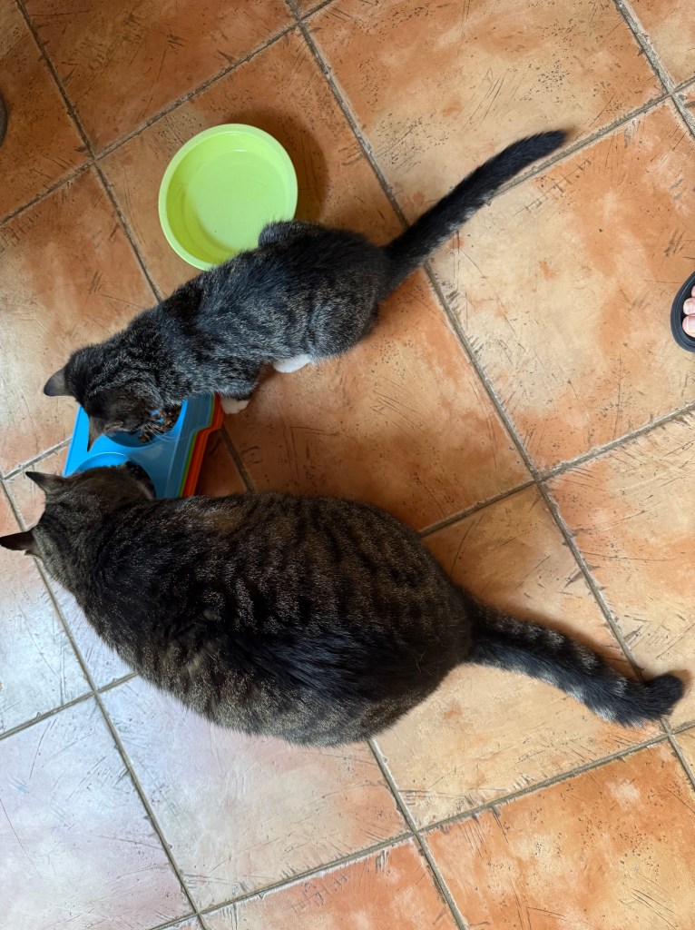 We have two cats of our own, both 10 years old now. Leo, the male tabby, made friends with Nico right away. He enjoyed grooming him, and the two of them ate side by side.